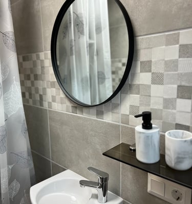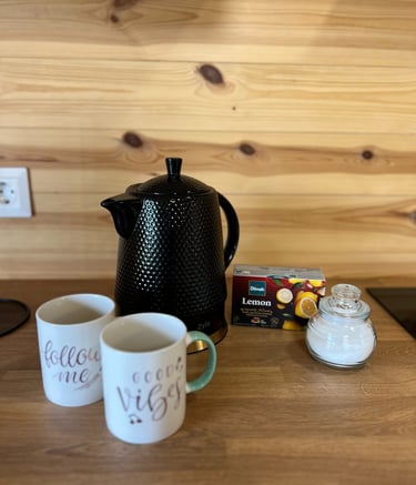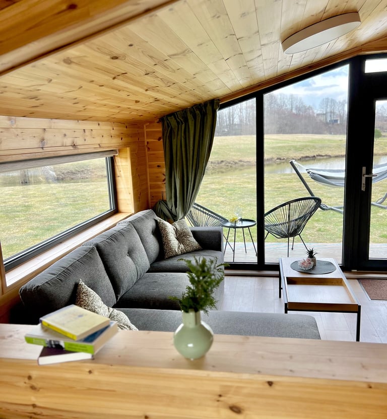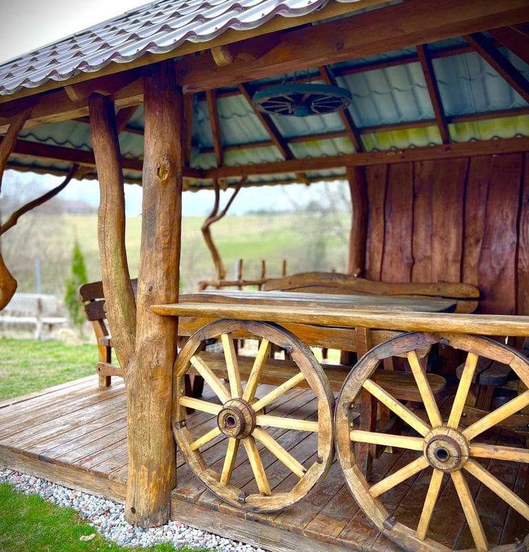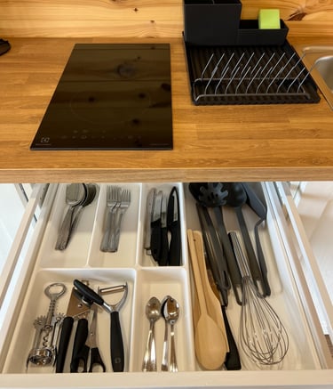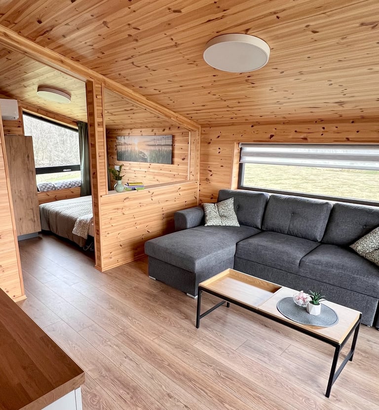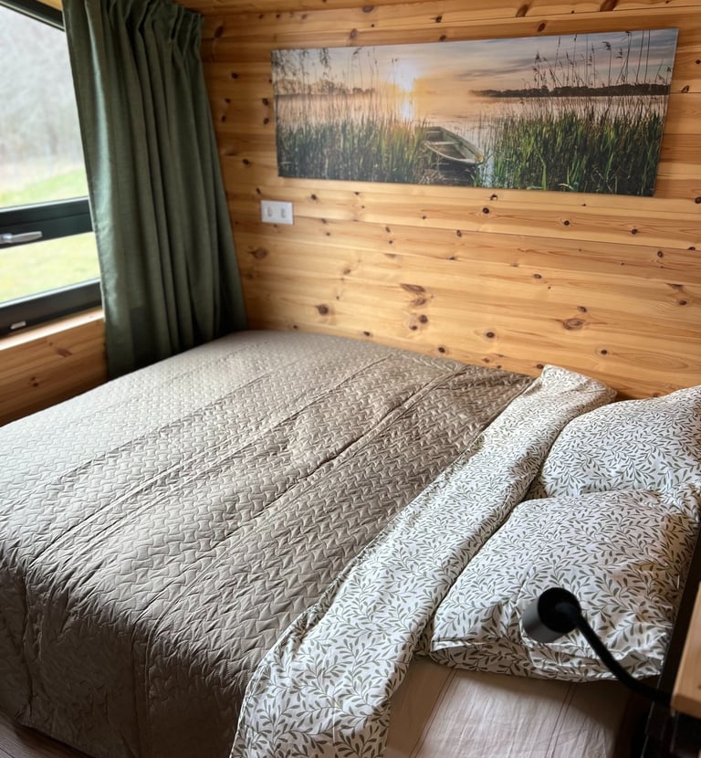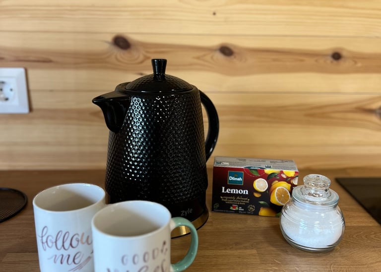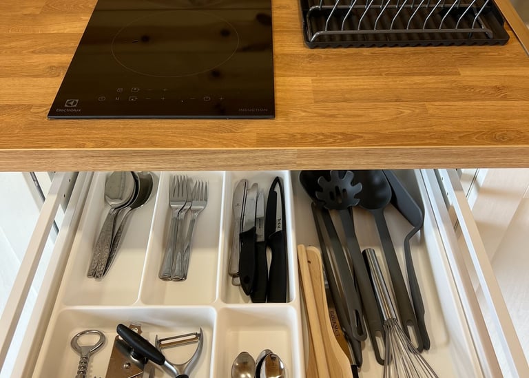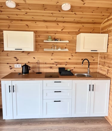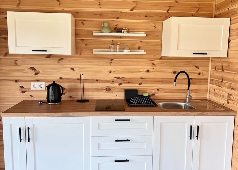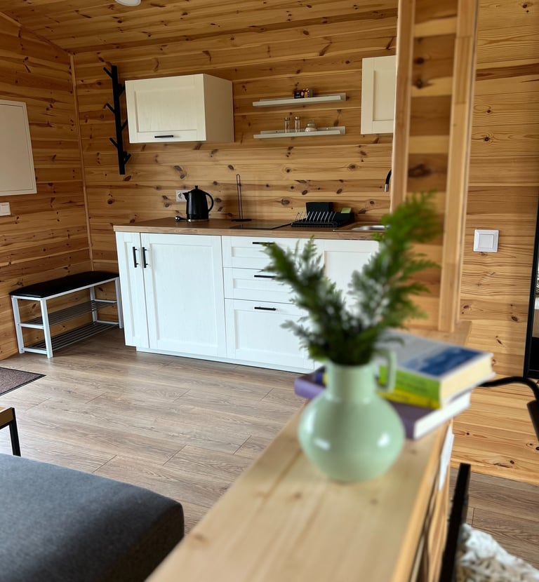 Kaitlentė, virdulys, šaldytuvas su šaldikliu, keptuvė, puodai, įrankiai. Maisto gaminimui reikalingi prieskoniai, kava, arbata ir cukrus.